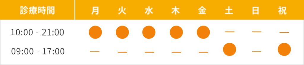 診療時間 | 月~金 9:00~20:00土曜 9:00~15:00 ※以下の時間帯は完全予約制で承ります 月~金20:00~22:00 土曜15:00~18:00 日・祝 9:00~15:00 |